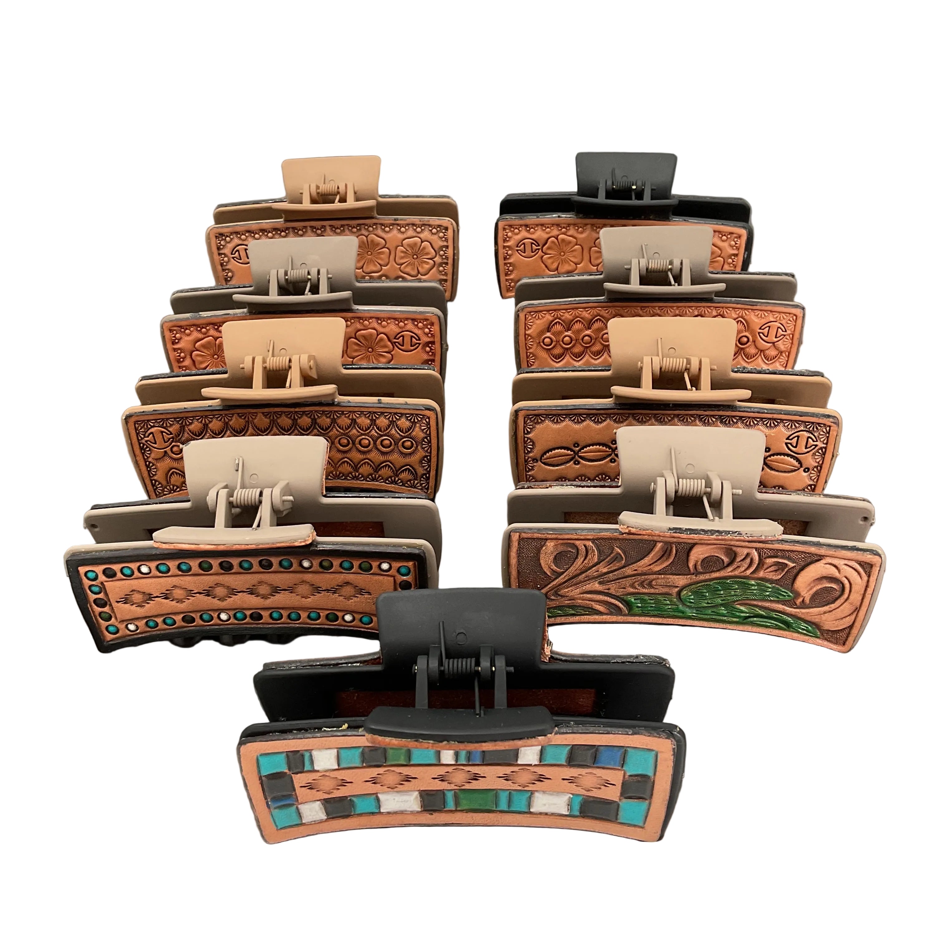 Crafted by master leatherman Tim Hawk right here at Hamley, these hand-tooled leather hair clips bring authentic Western style to your everyday look. Each piece showcases traditional leather work with distinctive character—perfect for anyone who appreciates genuine craftsmanship and timeless fashion. Whether you're dressing up for a special occasion or adding a touch of frontier flair to your daily routine, these clips deliver both function and Western charm.