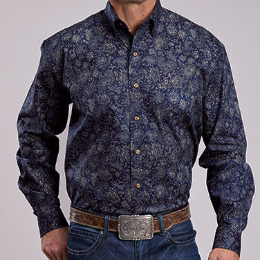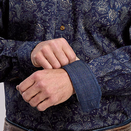 This classic western shirt features an all-over printed cotton poplin fabric with authentic Stetson branding throughout. The straight-cut back yoke includes a neat pleat for comfort, while denim trim inside adds durability. Look for the signature Stetson "S" embroidery and sleeve placket embroidery, plus adjustable mitered cuffs with two-button closure. The front button closure showcases stacked Stetson logo buttons for that iconic western look.
