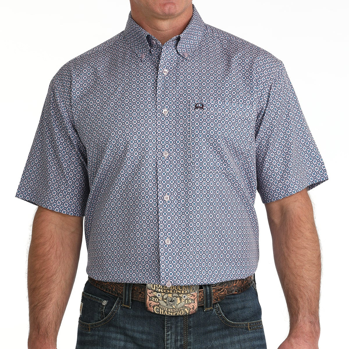 The Men's S/S Arenaflex Shirt from Cinch combines comfort and style for everyday wear. Crafted from lightweight printed poly-spandex fabric, this short-sleeve button-down offers flexibility and breathability. Purple buttons add a distinctive touch, while subtle logo embroidery enhances the design. Perfect for casual outings or layering, this versatile shirt delivers durability and a modern look.