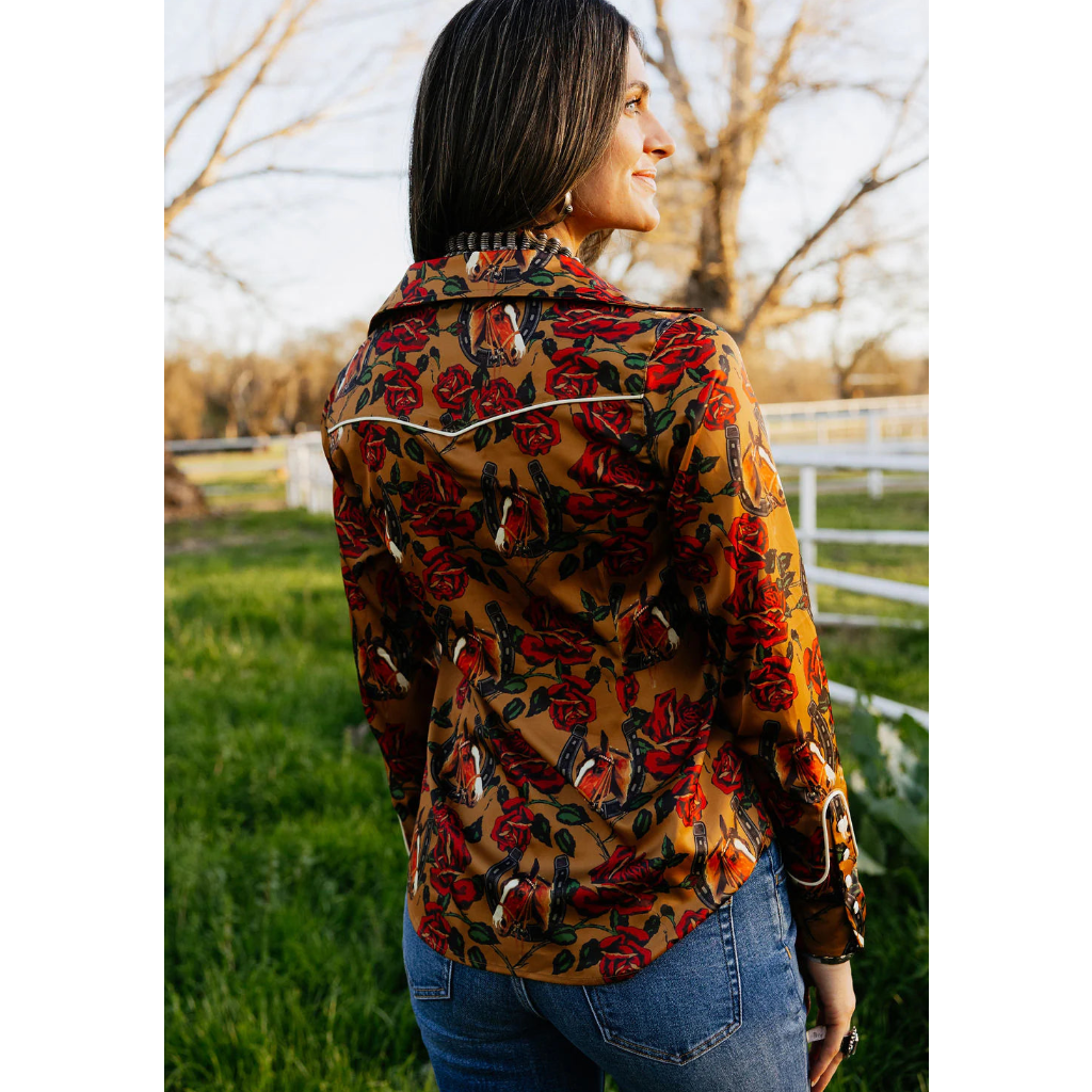 The Horses & Horseshoes Button Up is a true statement piece for the feminine western wardrobe. Designed on a rich brown base with elegant horses and blooming roses woven throughout, this silk button up blends equestrian tradition with romantic spring detail. Soft cream piping frames the silhouette beautifully, adding that classic western structure while keeping the look refined and polished. The silky fabric drapes effortlessly, giving this women’s western blouse a luxe feel that transitions seamlessly from rodeo evenings to elevated everyday styling.