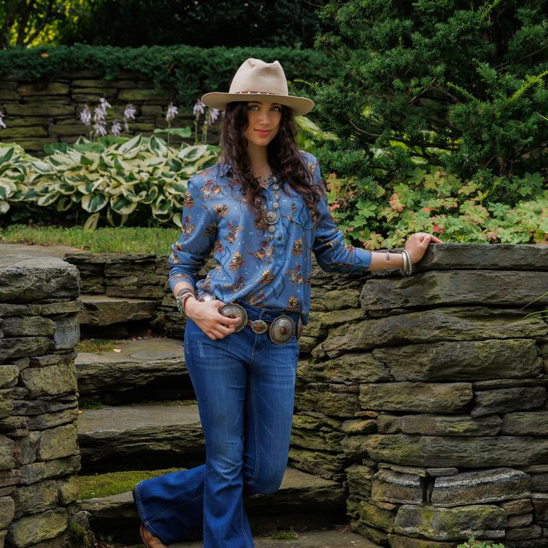 Women's Old Town Shirt by Tasha Polizzi brings classic western style to your wardrobe. Crafted from soft polyester faux linen, this indigo shirt features a traditional yoke design with a center back pleat for comfortable movement. The three-quarter button-down and roomy fit make it perfect for dress or everyday wear. A timeless piece that captures authentic western charm.