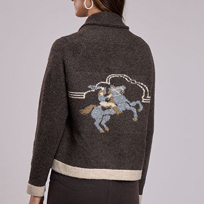 This women's cardigan from Stetson brings authentic Western style to your wardrobe. The cropped silhouette features a classic shawl collar and solid cream trim at the waist and sleeves for a polished look. A retro cowgirl graphic adorns the back, making it perfect for rodeo events or casual Western wear. The rich brown color pairs easily with jeans or skirts for versatile styling.