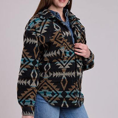 Elevate your western wardrobe with this striking Women's Woven Aztec Shirt Jacket from Roper. Crafted with a sophisticated geometric pattern in rich blue, turquoise, and brown tones, this versatile layer features a classic button-front design with a spread collar for refined styling. The tailored construction includes square chest pockets with flaps, single-button cuffs, and a shirt-tail hem for an authentic western aesthetic. Perfect for layering or wearing solo, this piece seamlessly transitions from ranch to casual outings.