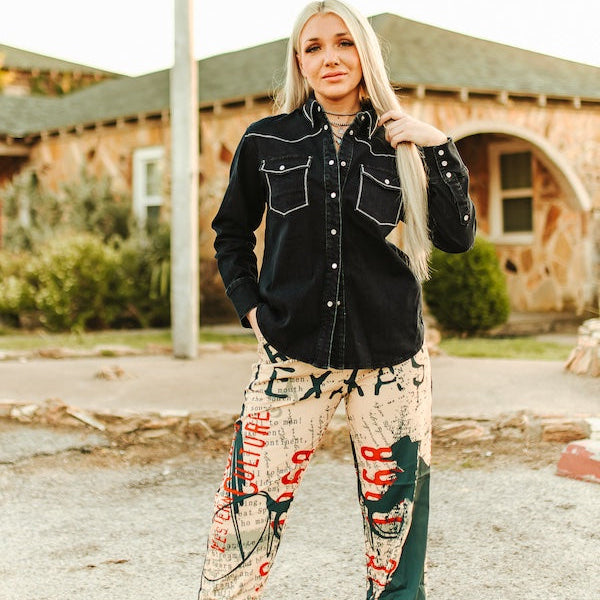 Bring bold rodeo spirit to your boutique with these statement Rodeo Texas Print Wide-Leg Pants from Lucky & Blessed. Designed for the modern cowgirl with a love for vintage Western charm, these lightweight wide-leg trousers feature an allover novelty print that celebrates Texas rodeo culture—complete with typewritten text, scroll-style numerals, and Western-themed graphics in bold red, black, and teal on a tan background. The relaxed jogger silhouette, high-rise fit, and elasticized hem make them comfortable for all-day wear while still turning heads. Perfect for styling with denim snap shirts or graphic tees, these pants are a standout choice for fashion-forward Western retailers looking to offer something fresh and fun for Spring or Fall collections. Whether you're stocking up for rodeo season, NFR pop-ups, or casual Western everyday wear, this piece blends vintage Americana with runway-worthy edge.