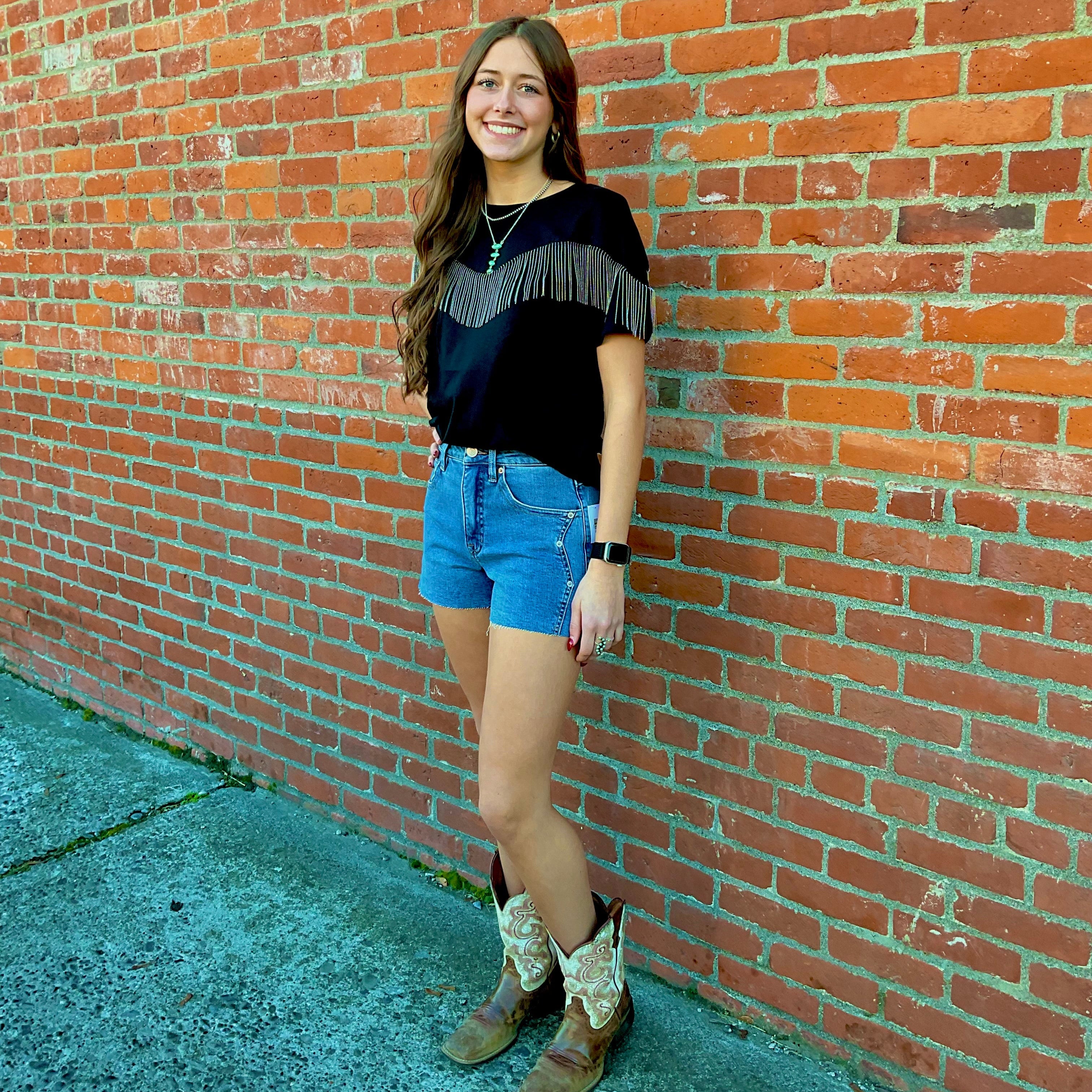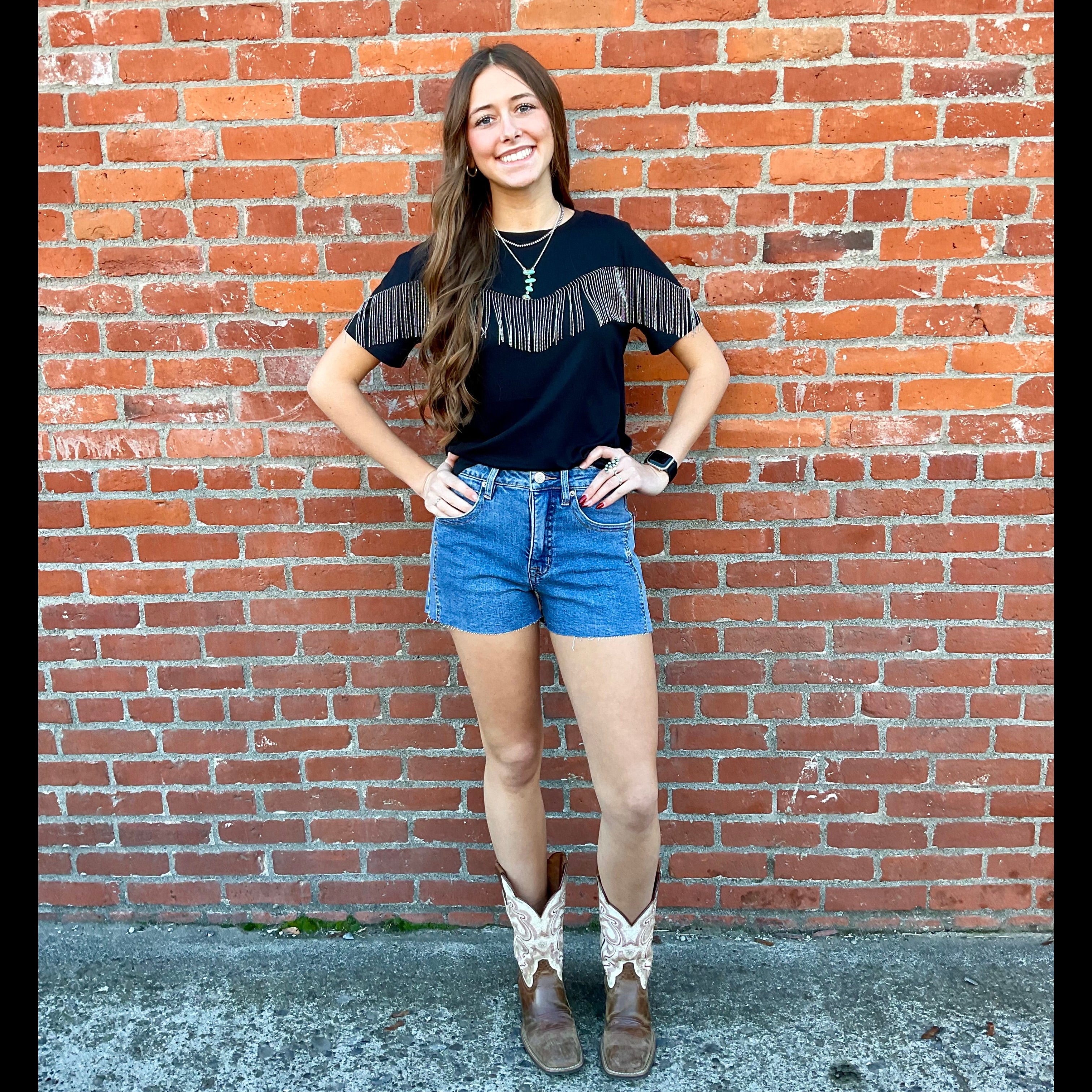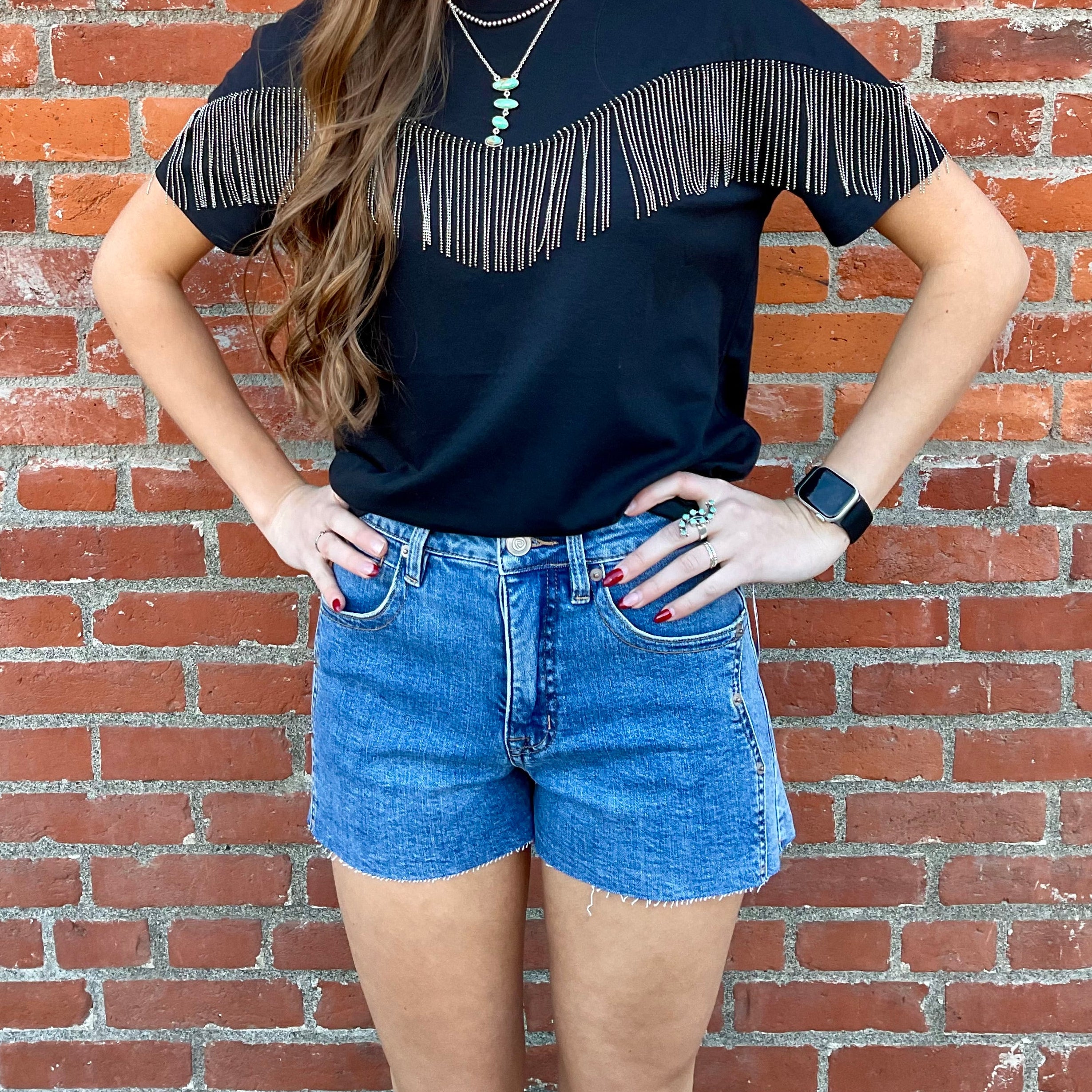 The Studded Fringe Shorts are a chic addition to your warm-weather wardrobe. Featuring a high rise, these shorts offer extra stretch for a comfy fit. The front studded, fringe details add the perfect touch of Western charm, perfect for any concert or fun outing.