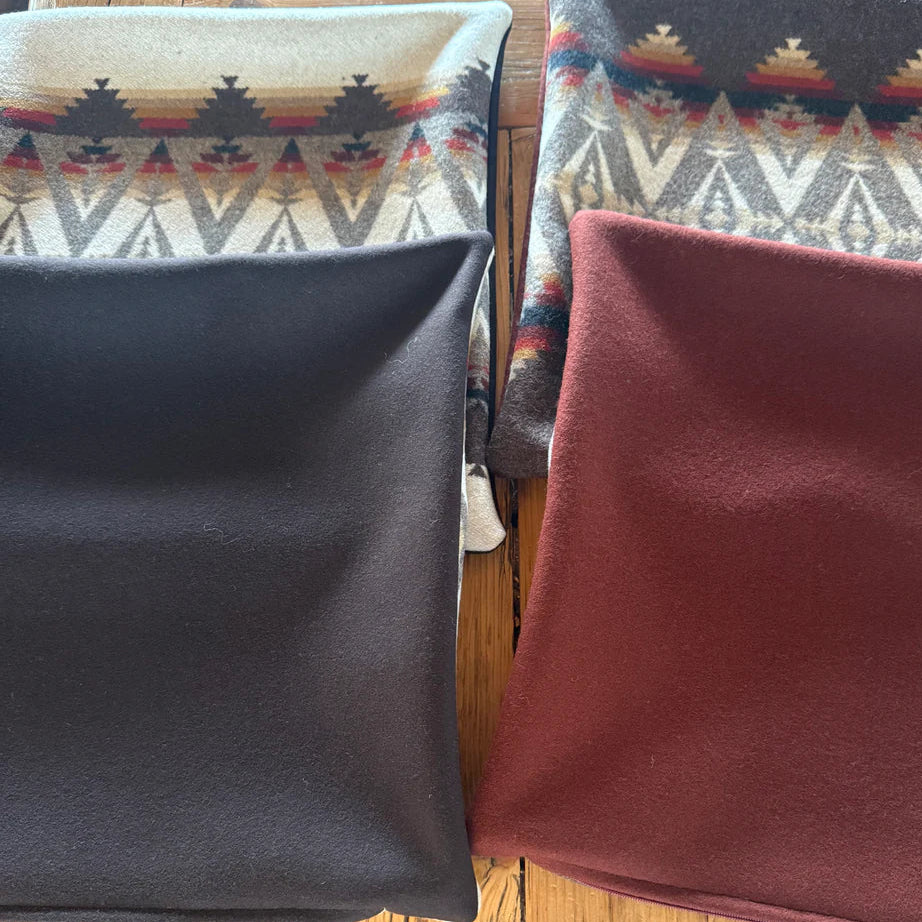 These small 14x14 brown pillows made with Pendleton® Pacific Brown Crest and Tobacco Eco-Wise wool fabric. Stuffed with pillow inserts have a nice full fit. Spot or dry clean only.