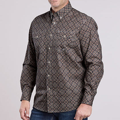 This men's long sleeve shirt features a button-down collar and a single-point back yoke with a pleat and locker loop for added comfort. It includes two one-point pockets with flaps and displays the distinctive Roper "R" embroidery. The Amarillo allover print and Bronze Medallion detailing add refined style to this classic design.