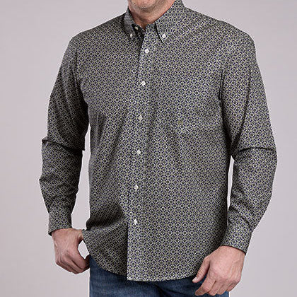 This men's long-sleeve shirt showcases an elegant Amarillo allover print, designed with classic Western sophistication. Features include a button-down collar, straight back yoke with pleating and locker loop for authentic ranch styling, and a single chest pocket. The iconic Roper "R" embroidery adds distinctive character to this versatile piece, perfect for both work and casual wear.