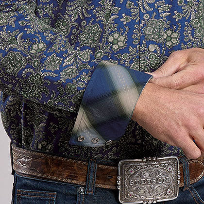 Elevate your western wardrobe with this distinguished Stetson Men's Long Sleeve Snap Shirt, showcasing an elegant moss paisley print on premium cotton poplin. Crafted with meticulous attention to detail, this piece features an ultra-deep curved back yoke, contrast interior trim, and signature Stetson embroidery on the right sleeve placket. The classic pearl logo snap front and three-snap cuffs deliver authentic western style, while the two-pocket design adds practical functionality. A refined choice for the discerning gentleman seeking timeless western sophistication.