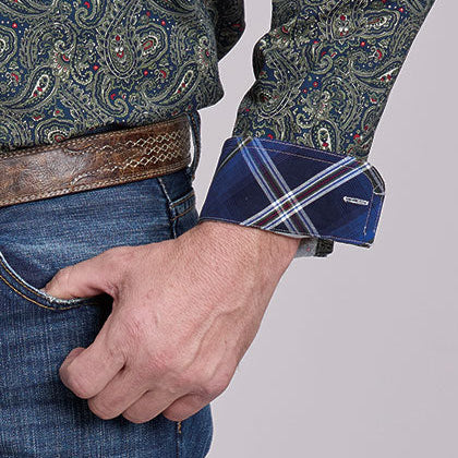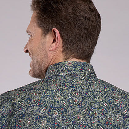 Elevate your western wardrobe with this distinguished men's long-sleeve shirt featuring an intricate forest paisley print. Crafted with refined details including a button-down collar, single-point back yoke with pleating, and functional dual chest pockets with flaps, this piece combines classic cowboy aesthetics with understated elegance. The signature Roper "R" embroidery and locker loop add authentic character to a versatile staple that transitions seamlessly from ranch to refined settings.
