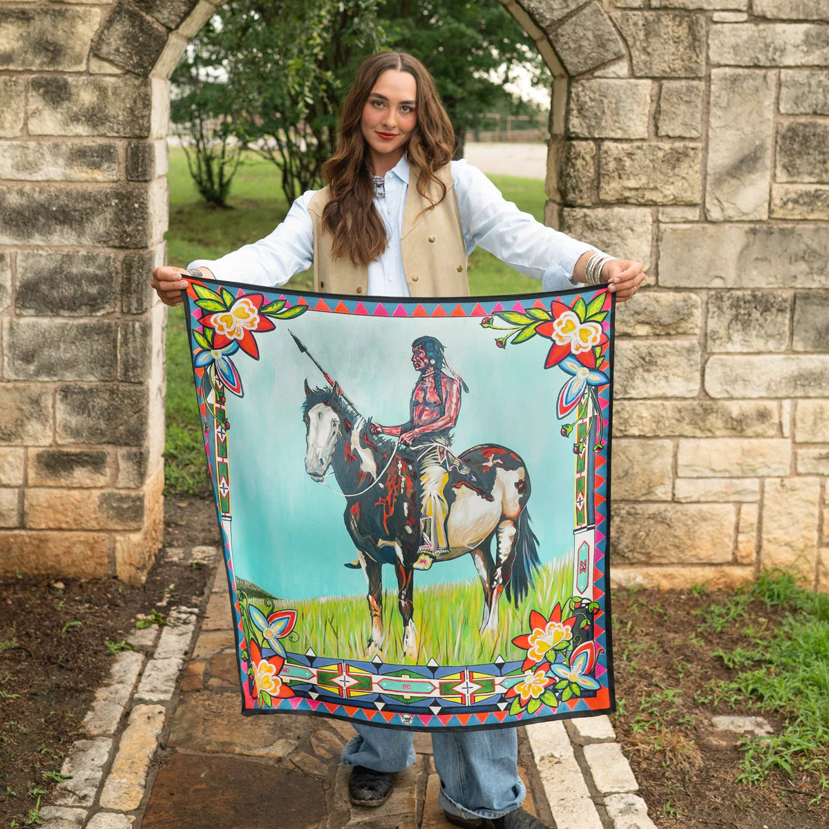 Fringe welcomes new artist Courtney Robertson to this year’s Artist Collection, bringing her storytelling brushstrokes and rich cultural awareness to silk. Her art draws from personal history and shared heritage, with a style rooted in the traditions of the American West.
