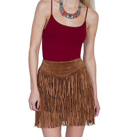 This playful suede fringe skirt features three tiered fringe panels. It has a wide single point waistband. Rear zip closure that gives it that fitted shape.