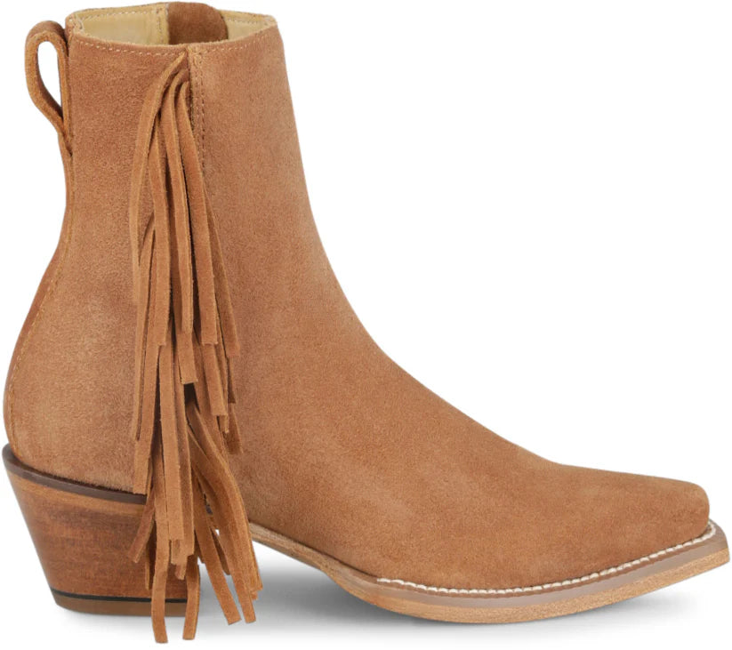 Justin Women's BEV Short Boot in Brown Suede features a fringe design with a snip toe, crafted from genuine suede leather and finished with a leather sole.