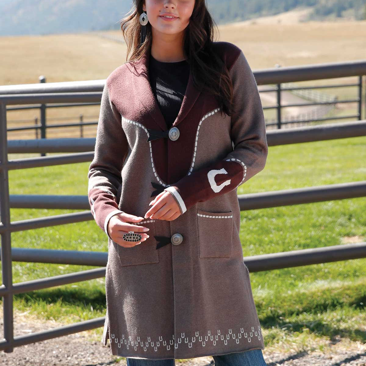 This Women's Bucking Bronco Duster by Cruel Girl features a sophisticated blend of 50% viscose, 28% polyester, and 22% nylon with 100% polyurethane trim. Designed with a shawl collar and long sleeves, it fastens with concho buttons down the front. The piece includes two patch handwarmer pockets and showcases a striking gray and brown color scheme adorned with white horseshoe and stitched details. The back is highlighted by an elegant cowboy on bucking bronco motif. This unlined duster offers timeless Western style with refined craftsmanship.