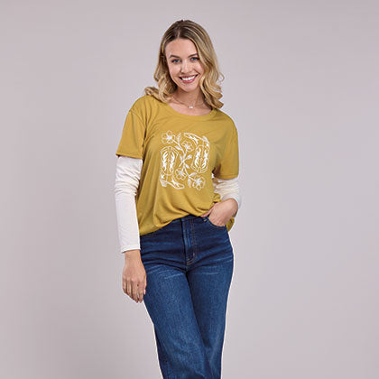 This women's long sleeve tee combines classic Western style with contemporary elegance. Crafted from a luxurious poly-rayon blend jersey, it features a refined gold-toned knit base with contrasting layered sleeves for added dimension. The scoop neckline is finished with a self-binding for a polished look, while sophisticated screen-printed detailing celebrates the iconic boots motif. Perfect for those who appreciate understated Western charm with a modern sensibility.