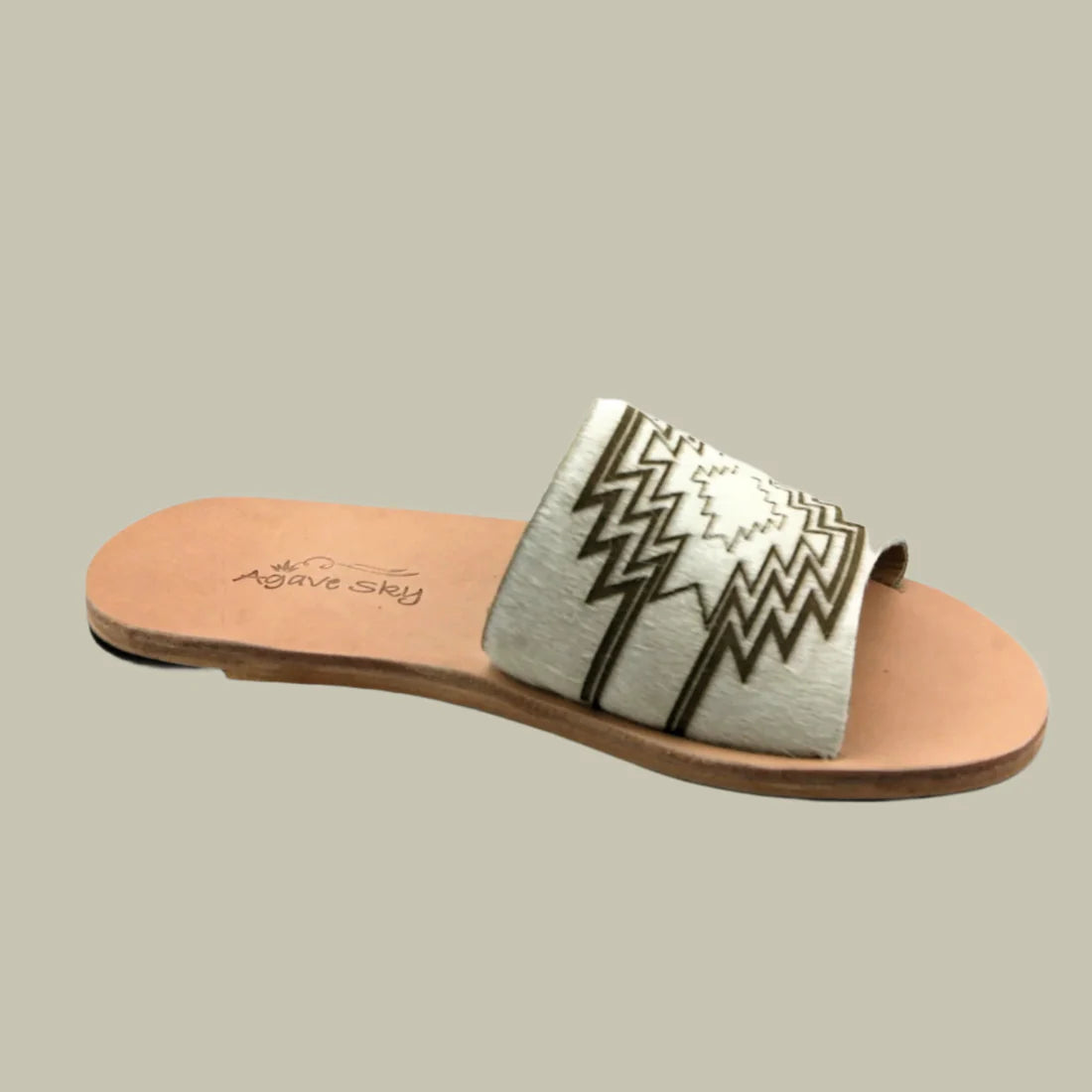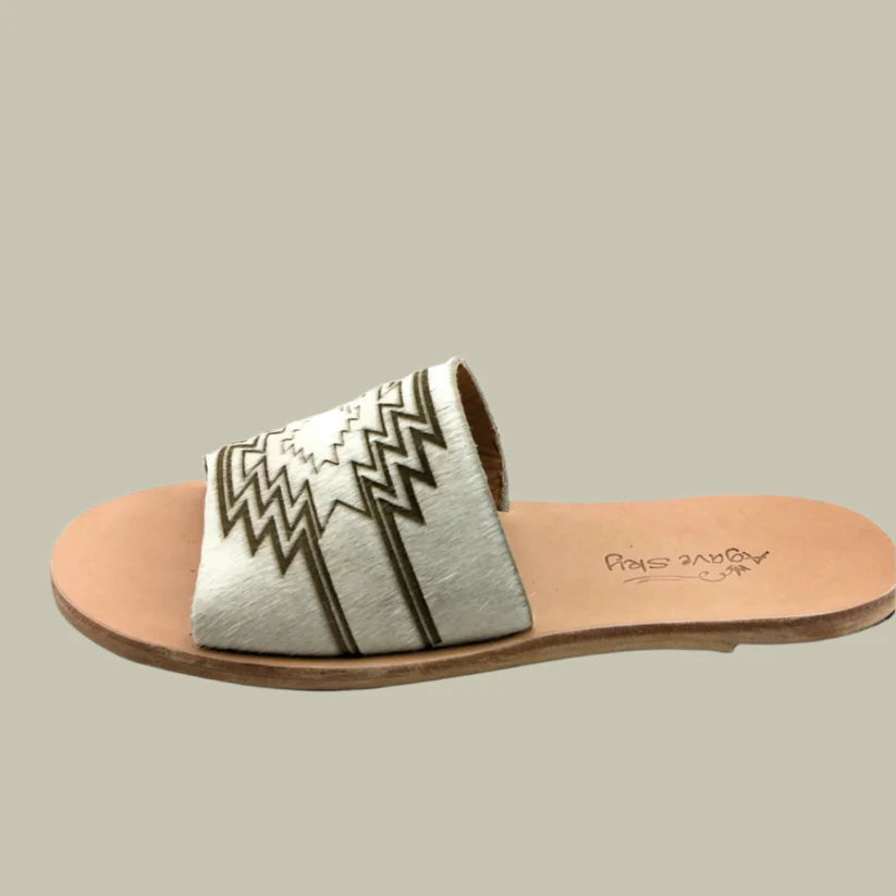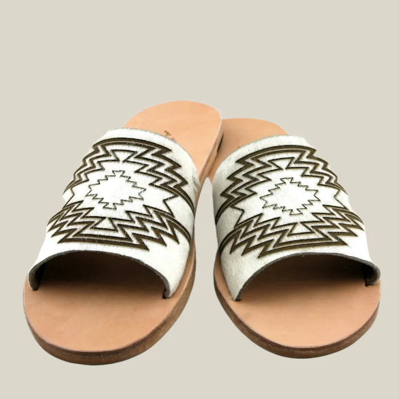 Hand made slides on our genuine leather sole. We've combined white cowhide with a laser burnt aztec design to create the newest style in western fashion.