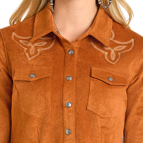 This Camel Microsuede Henley Shirt Dress features detailed embroidery on the front yokes and includes two snap flap pockets. Constructed with a snap placket, it combines 92% polyester and 8% spandex for a comfortable, flexible fit.